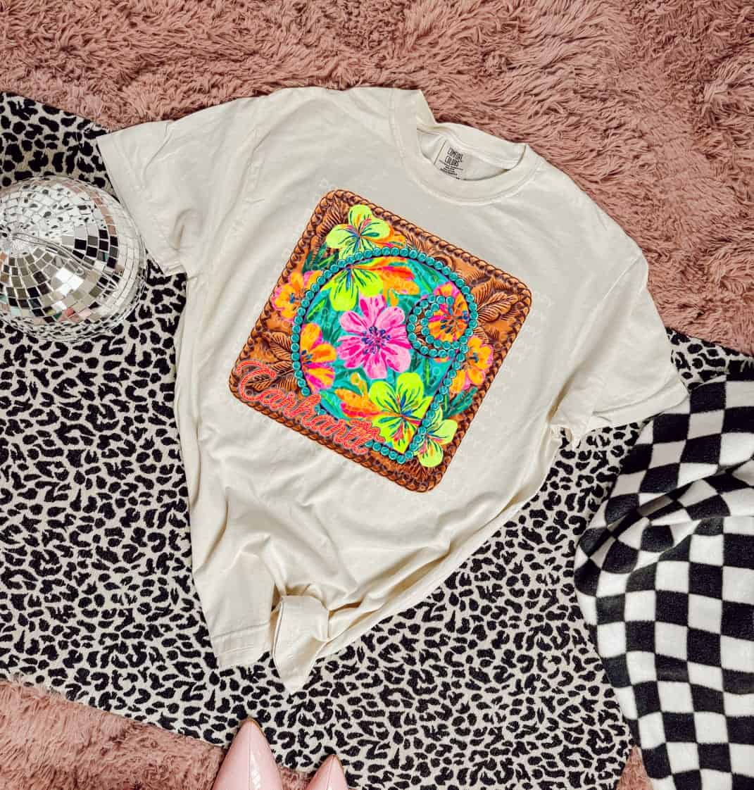 Western Floral Carhartt Bright Neon Flowers in Tooled Leather Style Design